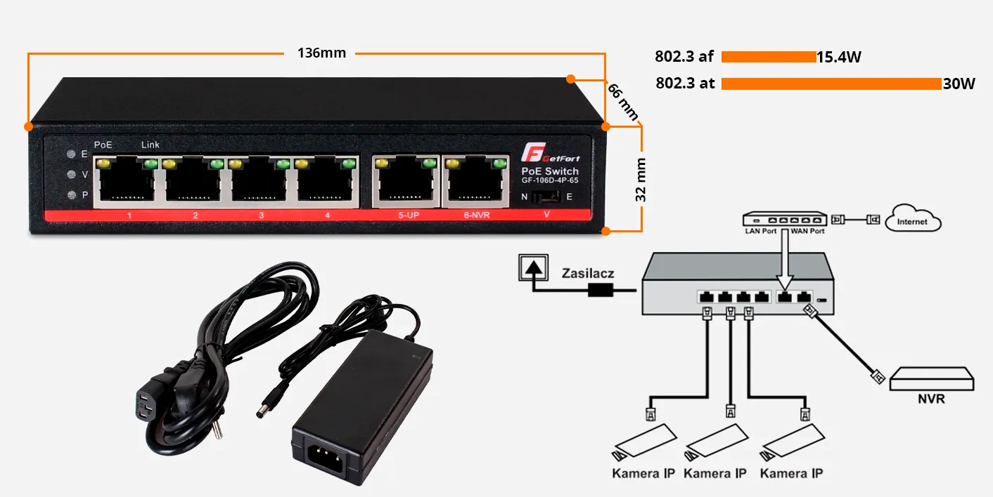 Switch Sieciowy PoE GETFORT 4 Porty + 2 UPLINK 65W