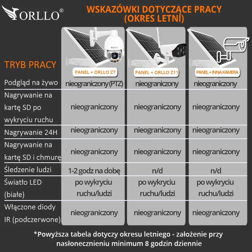 - Nieograniczony czas pracy - zasilanie kamery obrotowej bez ładowania solarnego wynosi do 150 godzin (z ładowaniem solarnym - czas nieograniczony